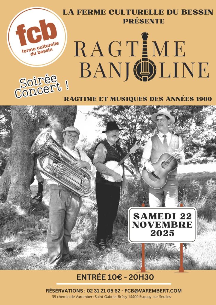Le trio Ragtime Banjoline vous fera voyager au cœur des musiques populaires du début du XXe siècle. Leur répertoire, à la fois entraînant et raffiné, met à l’honneur le ragtime, tout en explorant d’autres styles méconnus de la même époque. Une soirée pleine de swing et de bonne humeur, portée par Gilles Véron (banjoline et chant), Xavier Doré (guitare) et Sébastien Vallet (tuba).